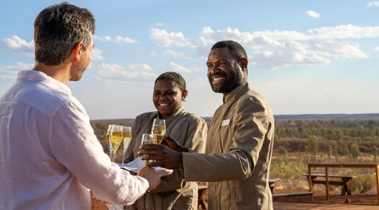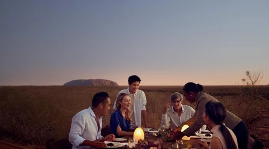 - 送迎あり / プライベートな砂丘の上にあるアウトバックのユニークな会場 / 2名様用のテーブルでくつろぎのひととき / サンセット時のシャンパンとカナッペ / ディジュリドゥの演奏 / ペンフォールドのプレミアム・おーストら頼。ワインと4コースディナー / 先住民の語り部による文化、歴史、スピリチュアル、土地についてのお話