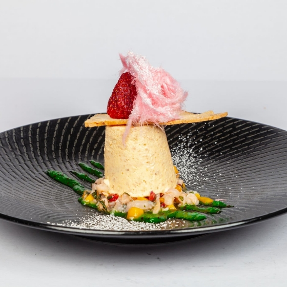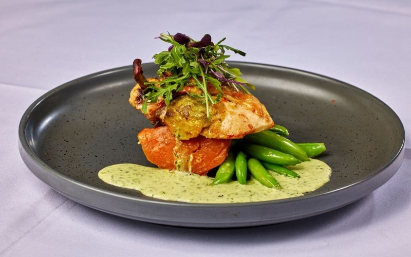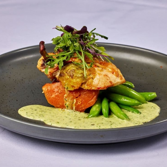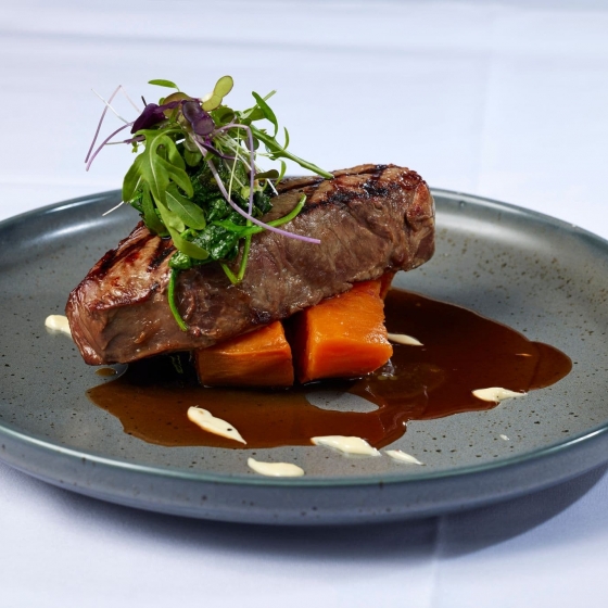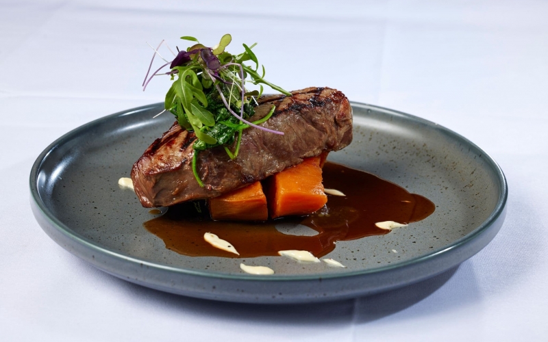 ハニーローストしたサツマイモと赤ワインジュを添えて提供します。