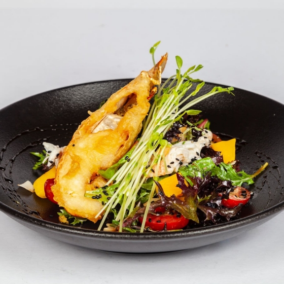 冷製エビを、軽いマンゴーサラダ、ミックスリーフ、