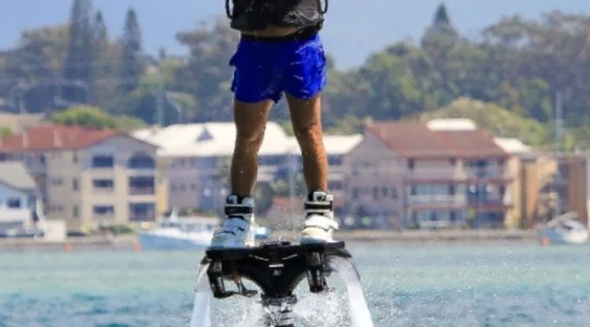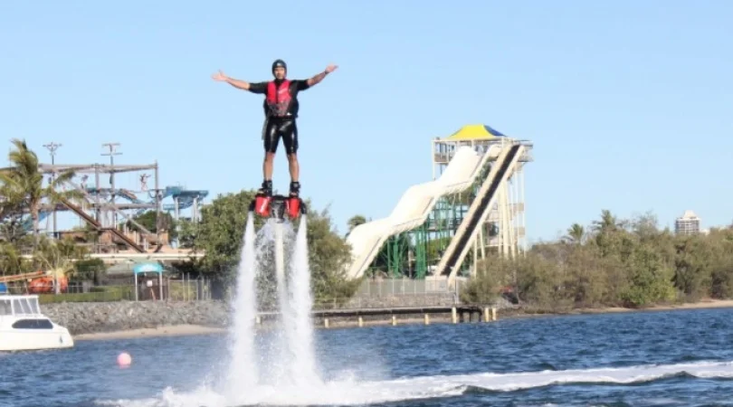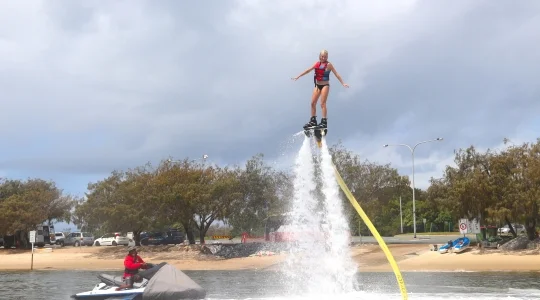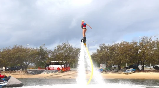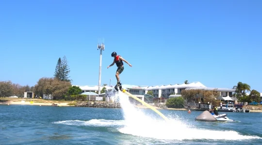 まるで未来的なアクティビティ!TVやネット動画で話題のフライボードをここゴールドコーストで体験しませんか?まるでクジラの潮吹きの上に乗るように、水圧でジャンプ!飛び上がる高さは、最大20mほど。上空から眺めるゴールドコーストの街並みは、最高です。