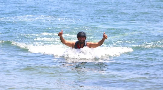 - フライボードでの飛行時間は約5分間ですが、ご参加前に説明・研修が10分程あります。 12歳以上のお客様に限りご参加可能です。 フライボードにご参加頂くには、泳ぐ事が出来る方が条件となります。