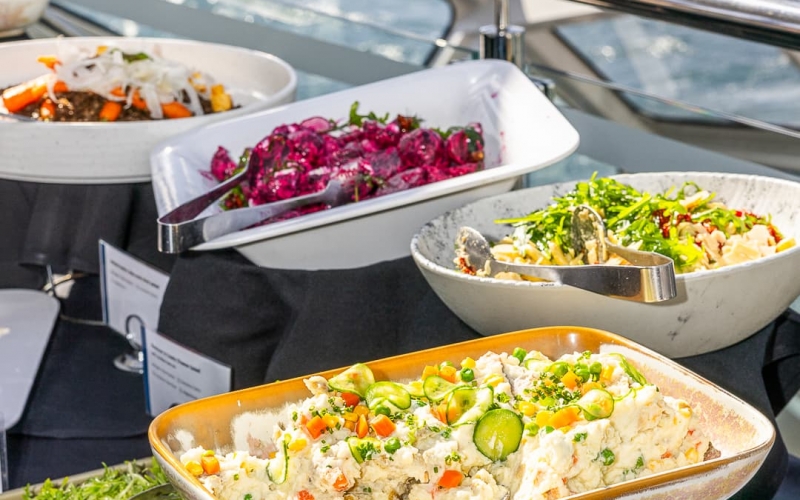サラダのビュッフェセレクション・ビーツとヤギのチーズのサラダ、キャラメリゼしたクルミ添え (D,N,V)