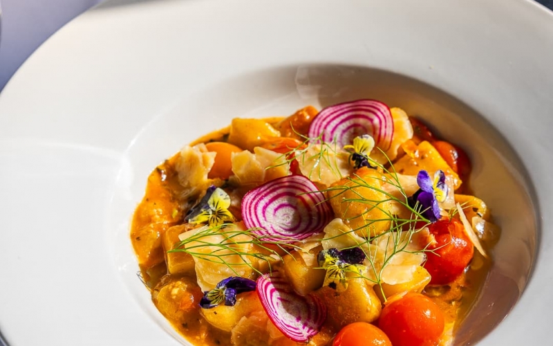 ・手作りビーツとリコッタチーズのラビオリ、バジルとほうれん草のペスト、松の実、枝豆、赤ワインのソース添え (V)