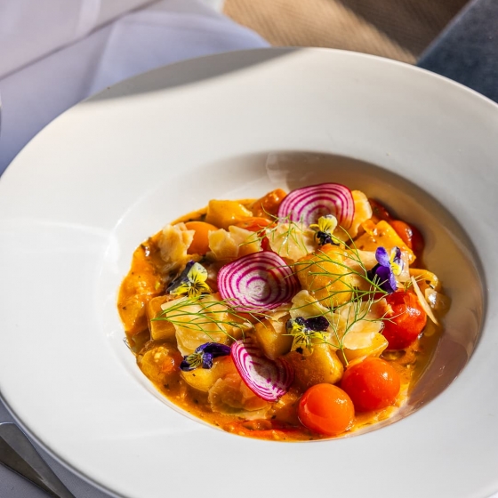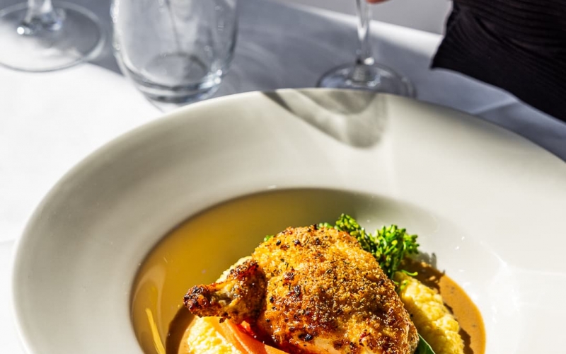 メイン・ローストチキンシュープリーム、クリーミーなポレンタ、季節の野菜、マッシュルームソース添え
