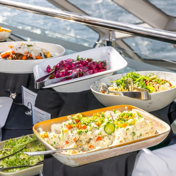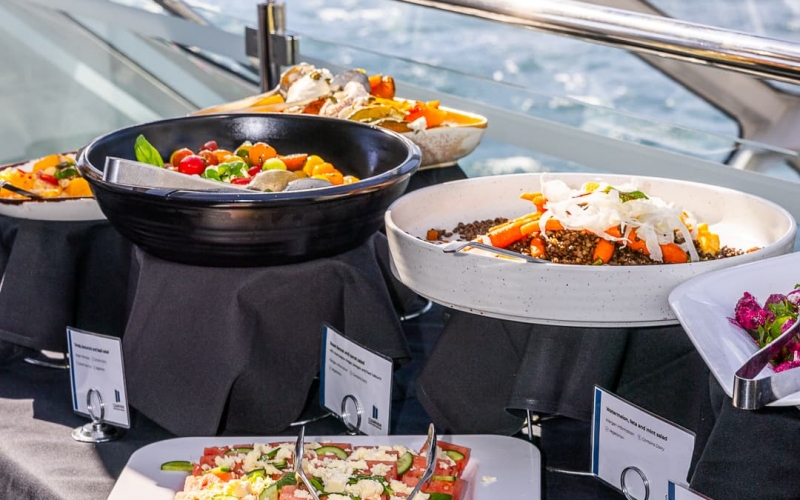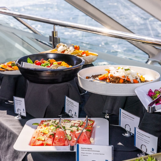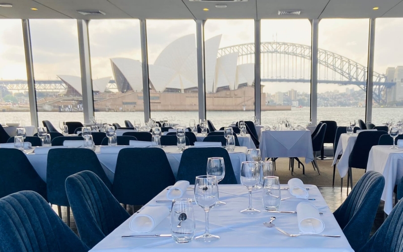 クリアビュー・グラスボート ランチクルーズで、シドニー湾の明るく開放的な景色と、美味しいランチをお楽しみください。全面ガラス張りのモダンな船内からは、オペラハウスやハーバーブリッジなど、シドニーを代表する景色を270°のパノラマビューでご堪能いただけます。サラダバーから始まるデラックスなランチと、丁寧なウェイターサービスが、優雅な午後のひとときを演出。観光の合間や、特別な日のランチに最適です。