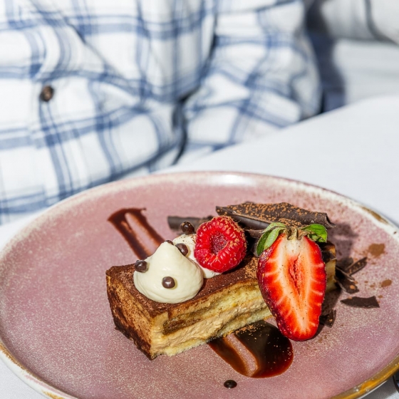 デザート・森のフルーツパブロバ、クレームシャンティ、メレンゲ、ストロベリークーリ添え (GF,V,D)