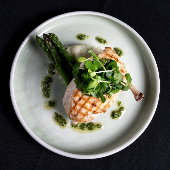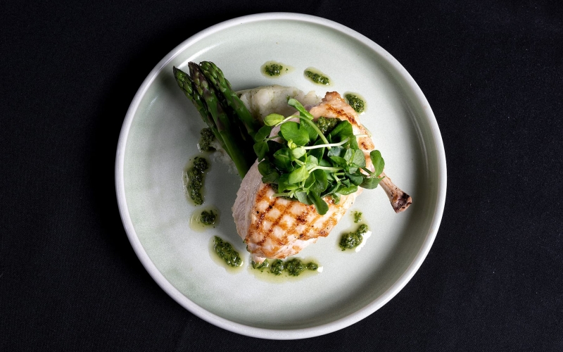 メイン・オート麦とキヌアの衣をつけた鶏胸肉のロースト、マッシュポテトとグリーンピース添え、ブロッコリーとソースヴィエルジュ (D, G, N)