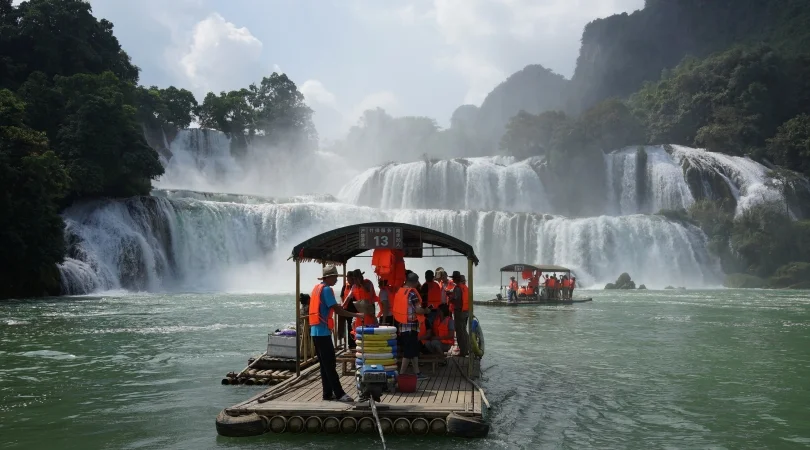中国とベトナムの国境をまたいで広がる巨大な滝。ベトナム語では「バンゾック滝」と言いベトナム最大級の滝として有名です。落差は約60m、滝幅は約200mあり、複数の国にまたがる滝としては世界2位の大きさと言われています。当ツアーでは手漕ぎの筏(いかだ)に乗って滝つぼの近くまで向かいます。眼前に迫る巨大な滝は大迫力!!マイナスイオンをたっぷり浴びてリフレッシュしてください!