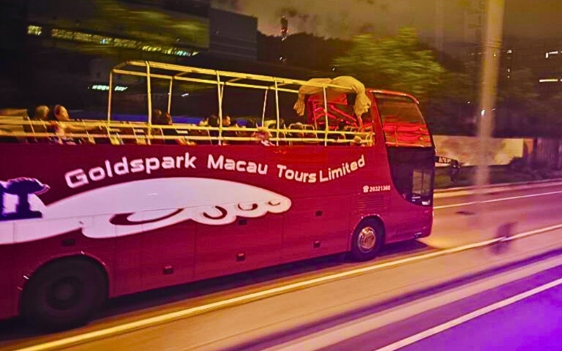 オープントップバスに乗車・マカオの夜景鑑賞へ出発(車内は英語でのご案内)
