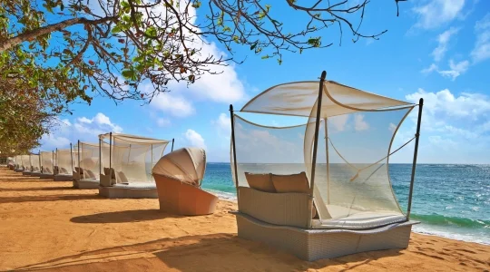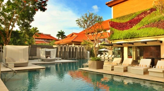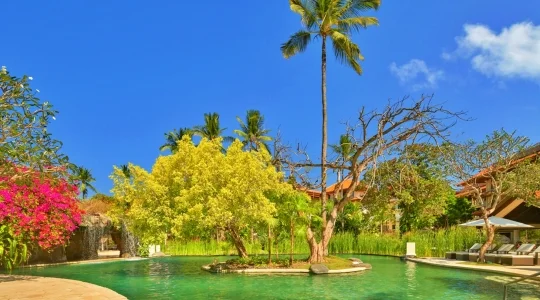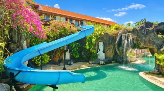 バリ島随一のリゾート地区であるヌサドゥアのビーチ沿いに建つウェスティンホテルは、充実した施設や行き届いたサービスが整う大型のラグジュアリーホテルです。リゾート内には、ウェスティンホテルらしいエレガントさとバリスタイルが融合した独特な雰囲気があります。ウォータースライダー付きの巨大プールをはじめ、多彩なレストランやショップ、テニスコート、スパ、ジム、キッズクラブと何でも揃い、そのホテルの規模の大きさはバリ島でもトップクラスです。 特にご家族でのバリ島旅行におすすめです。