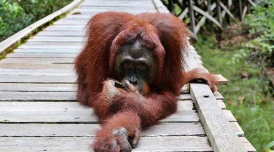 タンジュンプティン国立公園内にあるインドネシア最大の保護施設キャンプリーキーへご案内。