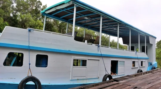 インドネシア最大のオランウータン観察地、「キャンプ・リーキー」に立ち寄り、オランウータンを至近距離で見学することができます。2泊3日のご旅行中、オランウータンとの遭遇は毎日100%です。オランウータンだけでなく、テングザルなども生息する、インドネシア最大の自然の1つをリバークルーズでご案内します。ゆっくりジャングルの中をクルーズでご案内します。