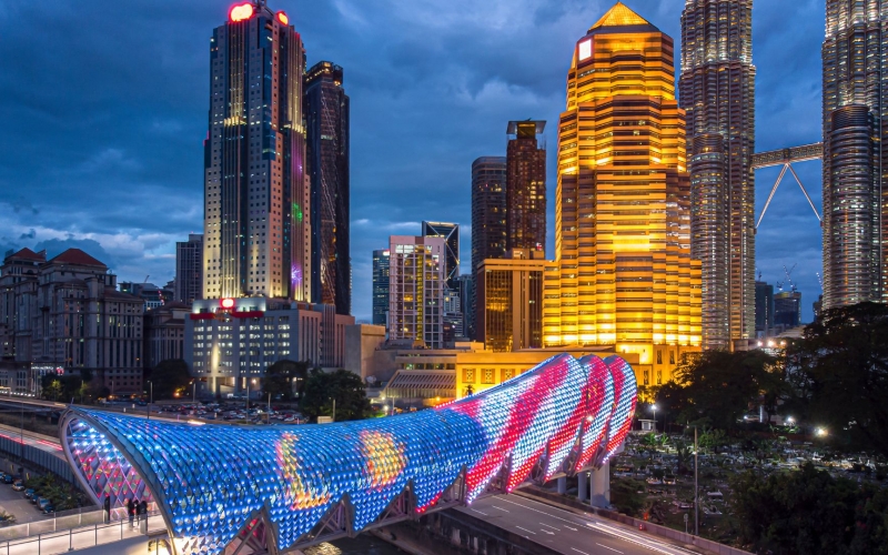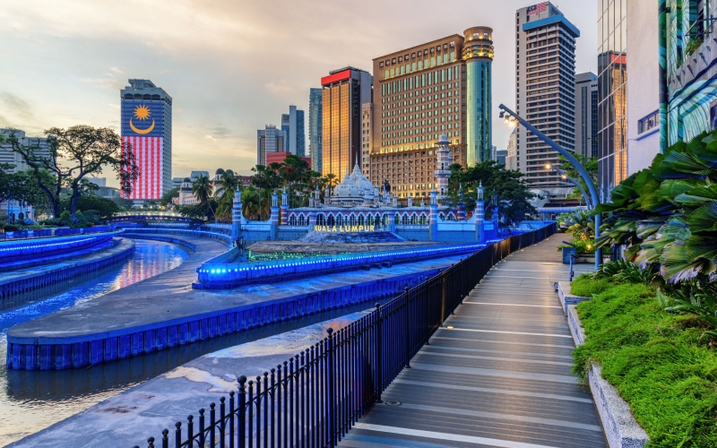歴史的景観の保存と近代的な都市開発を融合させる、クアラルンプールの都市づくりを象徴するエリアです。KL発祥の地といわれるクラン川とゴンバック川の合流点に位置し、両河川の浄化プロジェクトの一環として整備されました。夜になると川面が幻想的なブルーにライトアップされ、1909年に建立されたKL最古のモスク「マスジッド・ジャメ」も美しく照らされます。