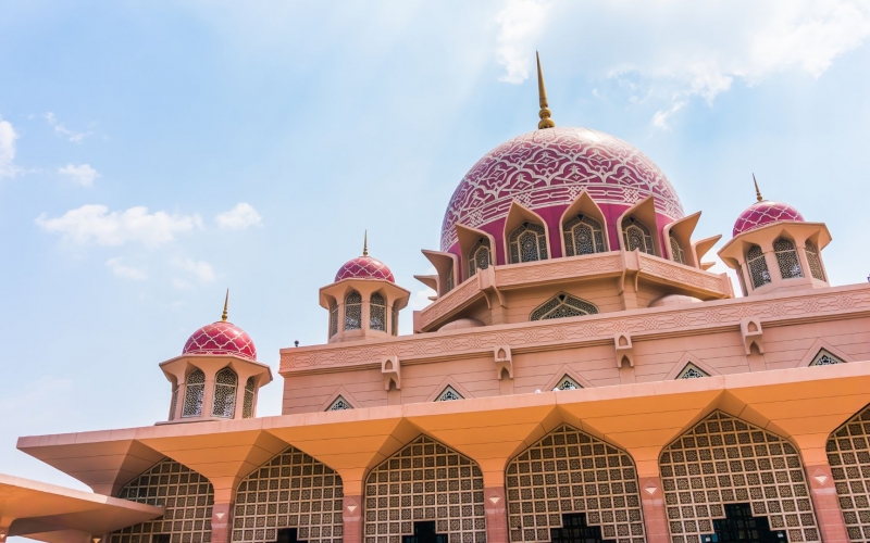 プトラ湖畔に建つ、淡いピンク色が可憐なマレーシアを代表するモスク。写真映え抜群の外観はもちろん内部の見学も可能です。湖とモスクのコントラストが美しい撮影スポットも多数!