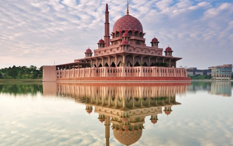 プトラ湖畔に建つ、淡いピンク色が可憐なマレーシアを代表するモスク。写真映え抜群の外観はもちろん内部の見学も可能です。湖とモスクのコントラストが美しい撮影スポットも多数!