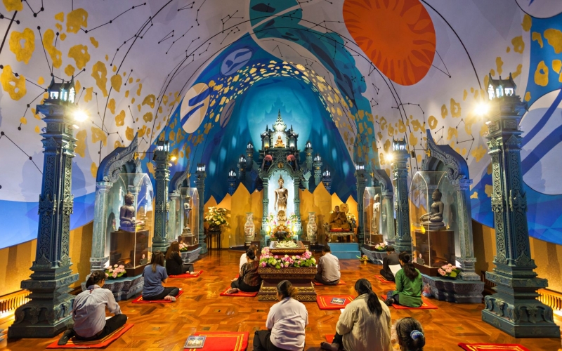 天井のステンドグラスや、タイの伝統工芸「ベンジャロン焼」を砕いて作られた美しいモザイクは必見です。