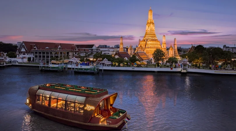 バンヤンツリーホテルが運営するラグジュアリークルーズ「アプサラ」が全面改装を経て、待望のリニューアルオープン。伝統的な木造船をイメージした船体と温かみのある照明が、ロマンチックな雰囲気を演出。お食事は 4コースのタイ宮廷料理をお楽しみいただけます。美しい夜景を眺めながら、5つ星ホテルのサービスと料理をご堪能下さい。