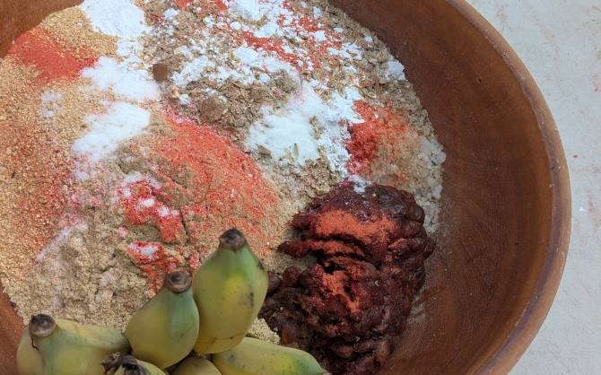 ビタミンや豆などを混ぜで栄養豊富なご飯を作る。