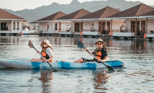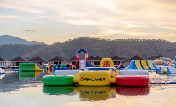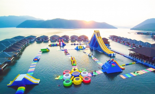 タイで最大の貯水量を誇るシーナカリンダムに浮かぶLAKE HEVEN RESORT。モルディブスタイルのリゾートホテルで、ホテル内にはウォーターパークもあります。陸地に立つのではなく、水面に浮かんでいるホテルです。ウォーターパークで目一杯遊ぶもよし!水の上で、水のゆれに身を任せてゆっくりしてみるもよし!ホテルからはカンチャナブリの雄大な景色を楽しむことが出来ます。