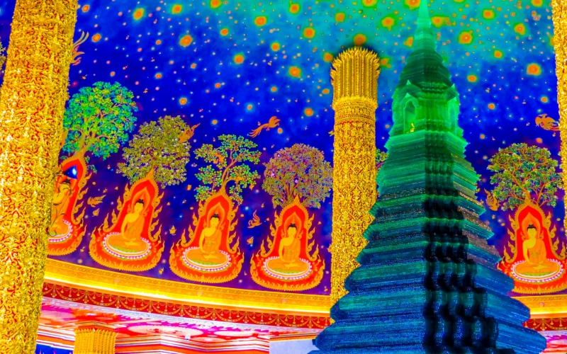 パワースポットとしても、フォトジェニックな名所としても人気のワット・パクナム。エメラルドに輝くガラス仏塔と色鮮やかな天井画は必見です。