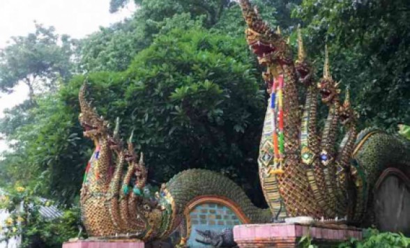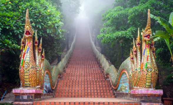 ドイステープ寺院は海抜 1,053mの山頂にあり、1384年に建立されたタイで最も有名な寺院の一つです。 頂上の黄金色に輝く仏塔の内部には仏舎利が納められており、 山頂の寺院までは約300段の階段を登ります。 その手すりにはタイの神話に出て来る二匹の極彩色の大蛇が彫刻されています。山頂展望台から眺めるチェンマイ市内の景色は圧巻です!