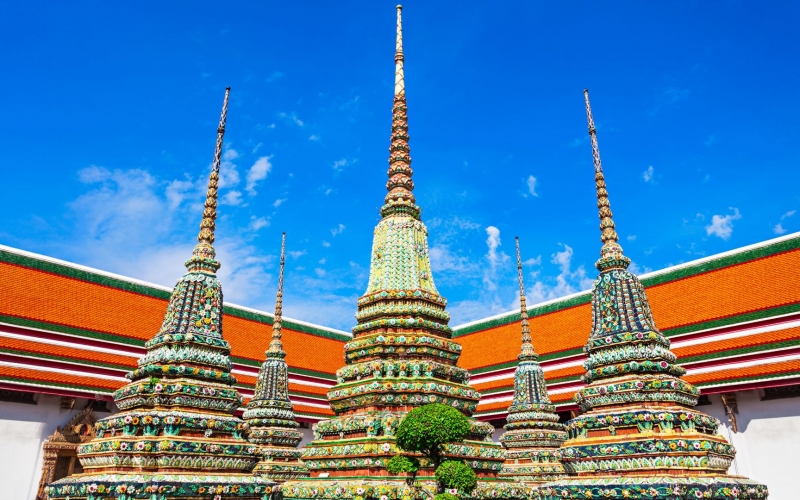 1869年、ラーマ5世によって建立された王室寺院。五色のモザイク磁器で彩られた仏塔が見どころです。