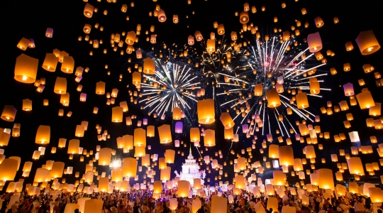 人々は願いを込めて紙製のランタン「コムローイ」を夜空へ放ち、 無数の光が空一面を埋め尽くす幻想的な光景が広がります。
